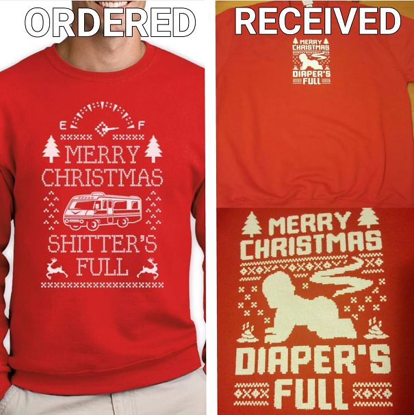 Avete presente quegli orribili maglioni di Natale che si vedono nei film inglese e americani? Niente di strano, a loro piacciono a me e a Bridget Jones no ma non è questo il punto, qui si parla di acquisti online andati male, però almeno in modo buffo. Quello che il cliente ha ricevuto è talmente orrendo da essere divertente, inutile dire che lui si aspettava di ricevere qualcosa di diverso ma a giudicare dal sorriso l’ha presa con spirito.